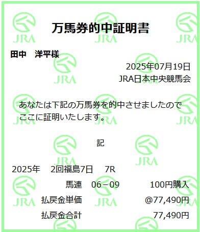●7月19日福島7R:46馬(16番人気)2着⇒3連複135万7680円、馬連7万7490円、ワイド6万9460円、2万40円